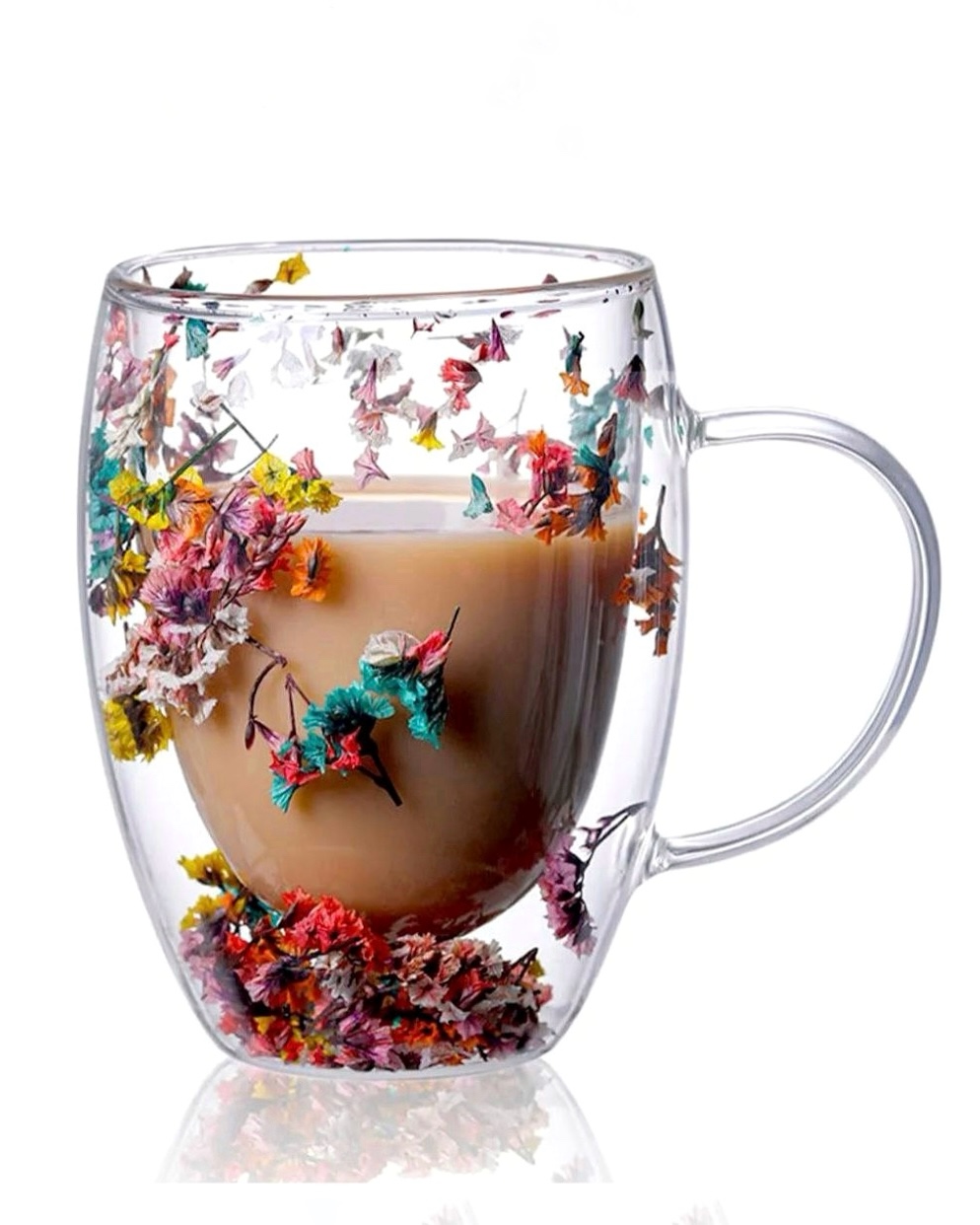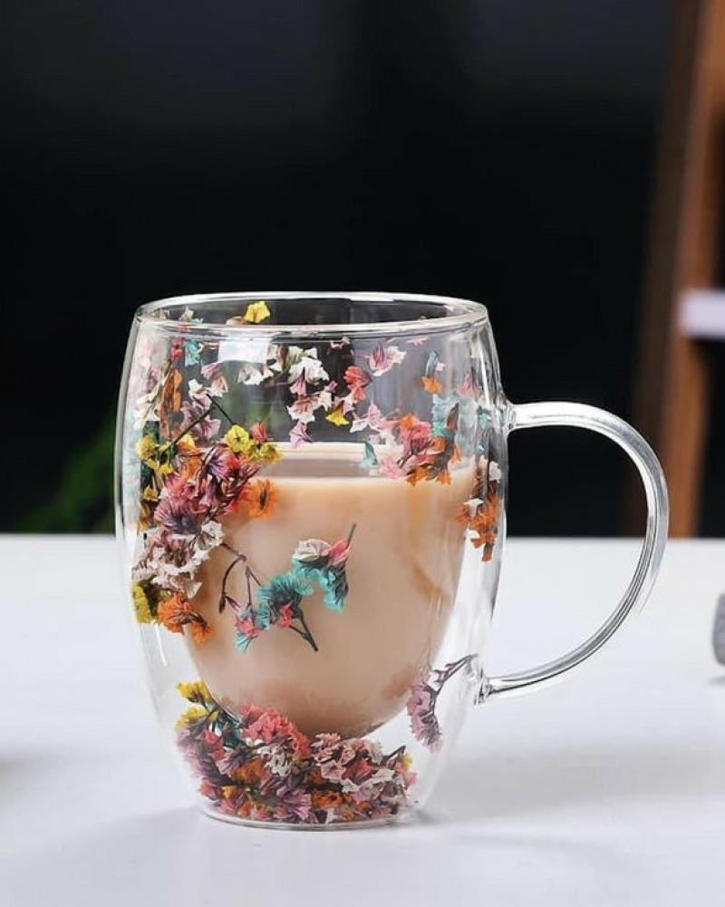 لیوان دو جداره گلدار که در بین جداره های آن از گلهای زیبای طبیعی استفاده شده است که در هنگام مشاهده حس زیبای طبیعت را به شما القا میکند . یکی از مزیت های آن به علت دوجداره بودن محصول مایع داخل آن دیرتر دمای خود را از دست میدهد.