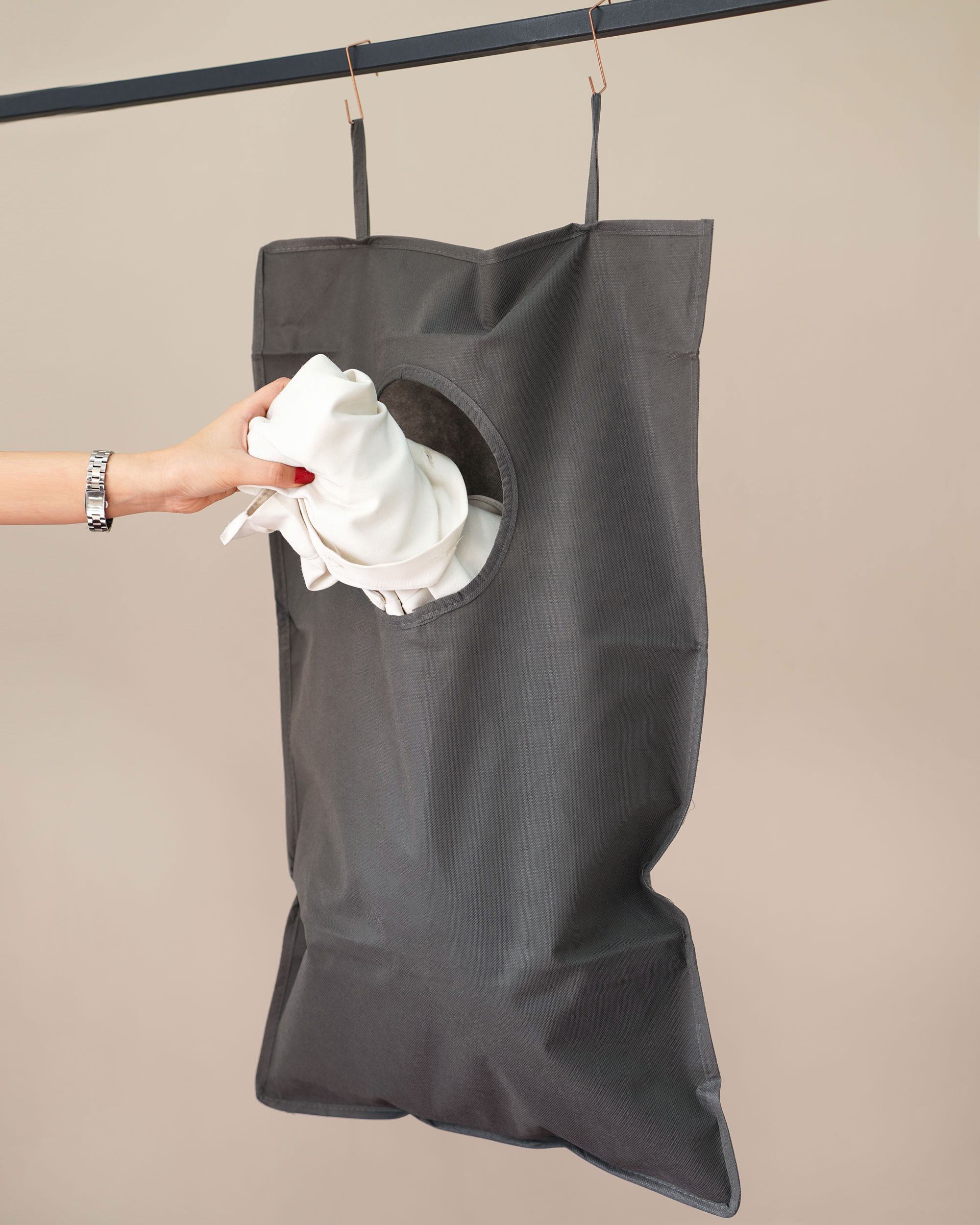 کیسه رخت چرک پشت دری با کمک 2 عدد قلاب بسیار محکم بر روی درب محل های مختلفی چون ( حمام ، اتاق خواب ، کمد دیواری و … ) آویزان شده و قابلیت این را دارد تا تمام لباس های چرک را در یک جا و به دور از دید و البته در دسترس برای شستشو نگهداری کرده و از قاطی شدن لباس های چرک با لباس های تمیز جلوگیری میکند.