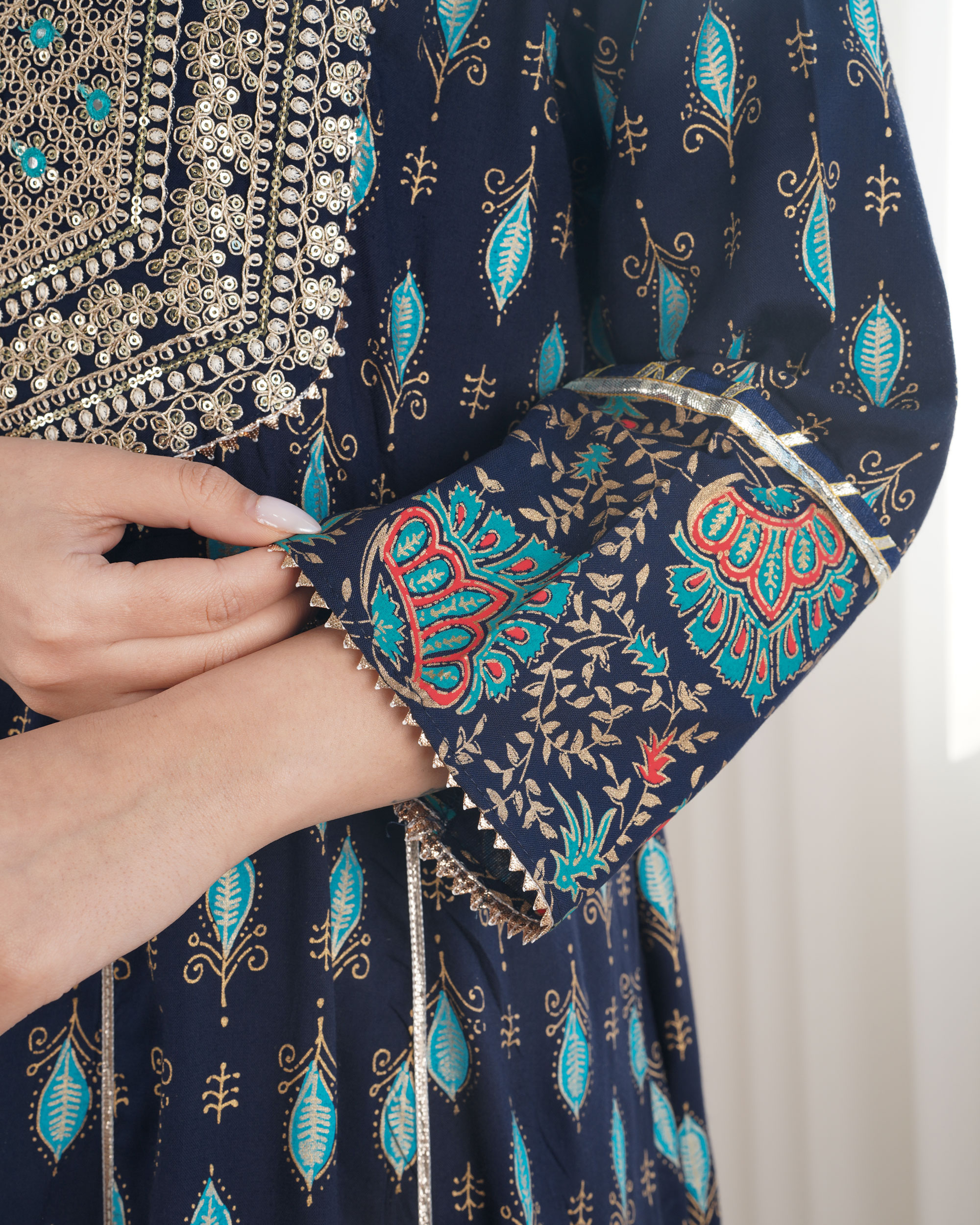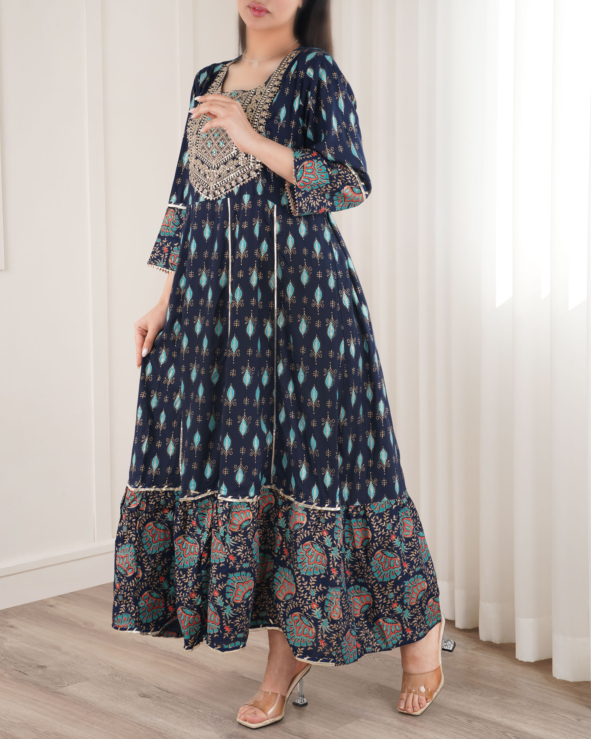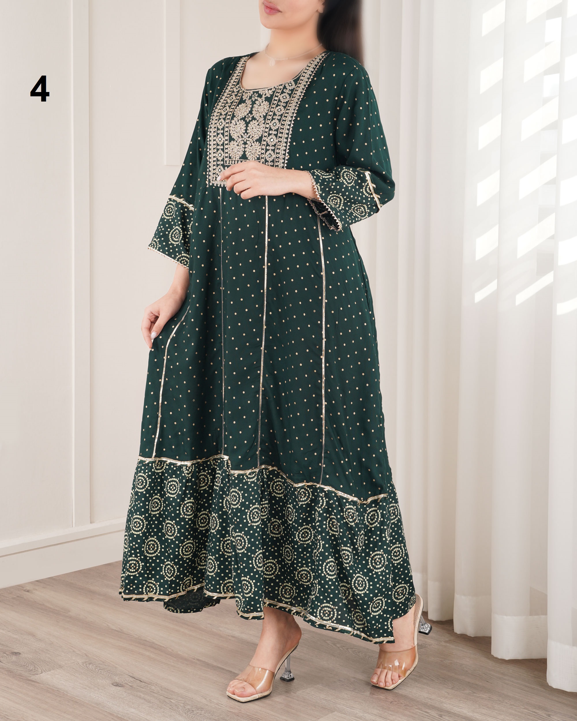 | سایز L | دور سینه : حدودا 94 سانتی متر دور باسن : حدودا 122 سانتی متر دور کمر : حدودا 84 سانتی متر دور بازو : حدودا 32 سانتی متر آستین : از کنار یقه حدودا 53 سانتی متر قد لباس : حدودا 122 سانتی متر |