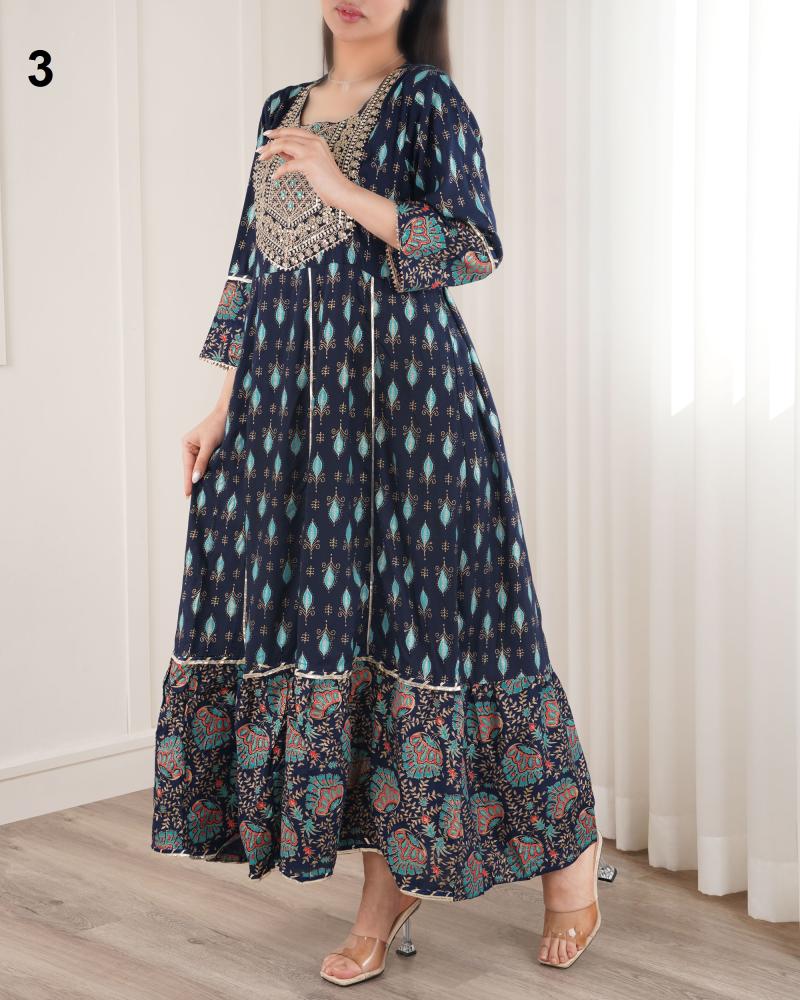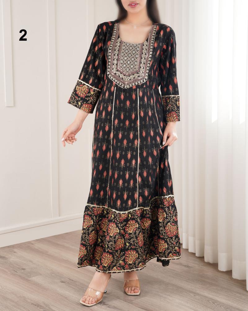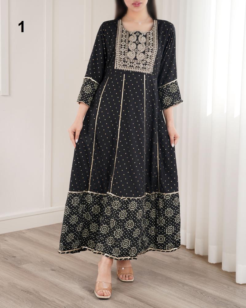 | سایز 2XL | دور سینه : حدودا 112 سانتی متر دور باسن : حدودا 130 سانتی متر دور کمر : حدودا 108 سانتی متر دور بازو : حدودا 38 سانتی متر آستین : از کنار یقه حدودا 53 سانتی متر قد لباس : حدودا 124 سانتی متر |