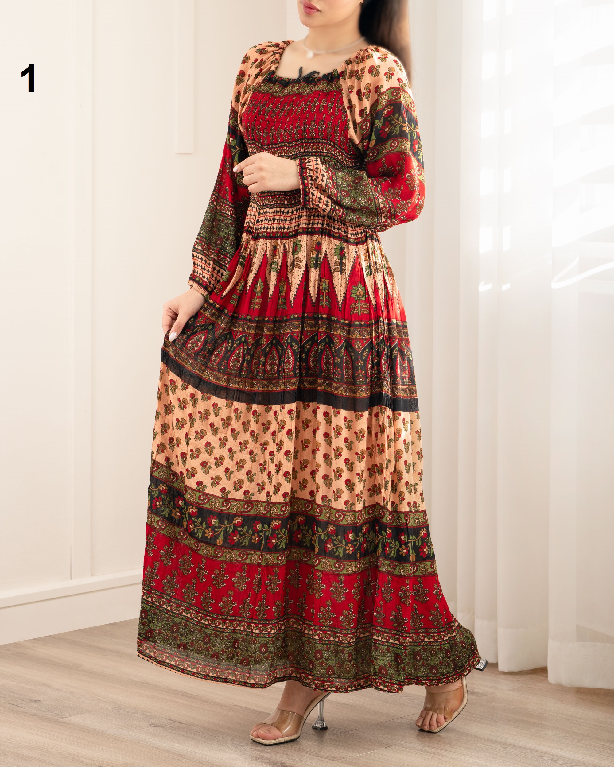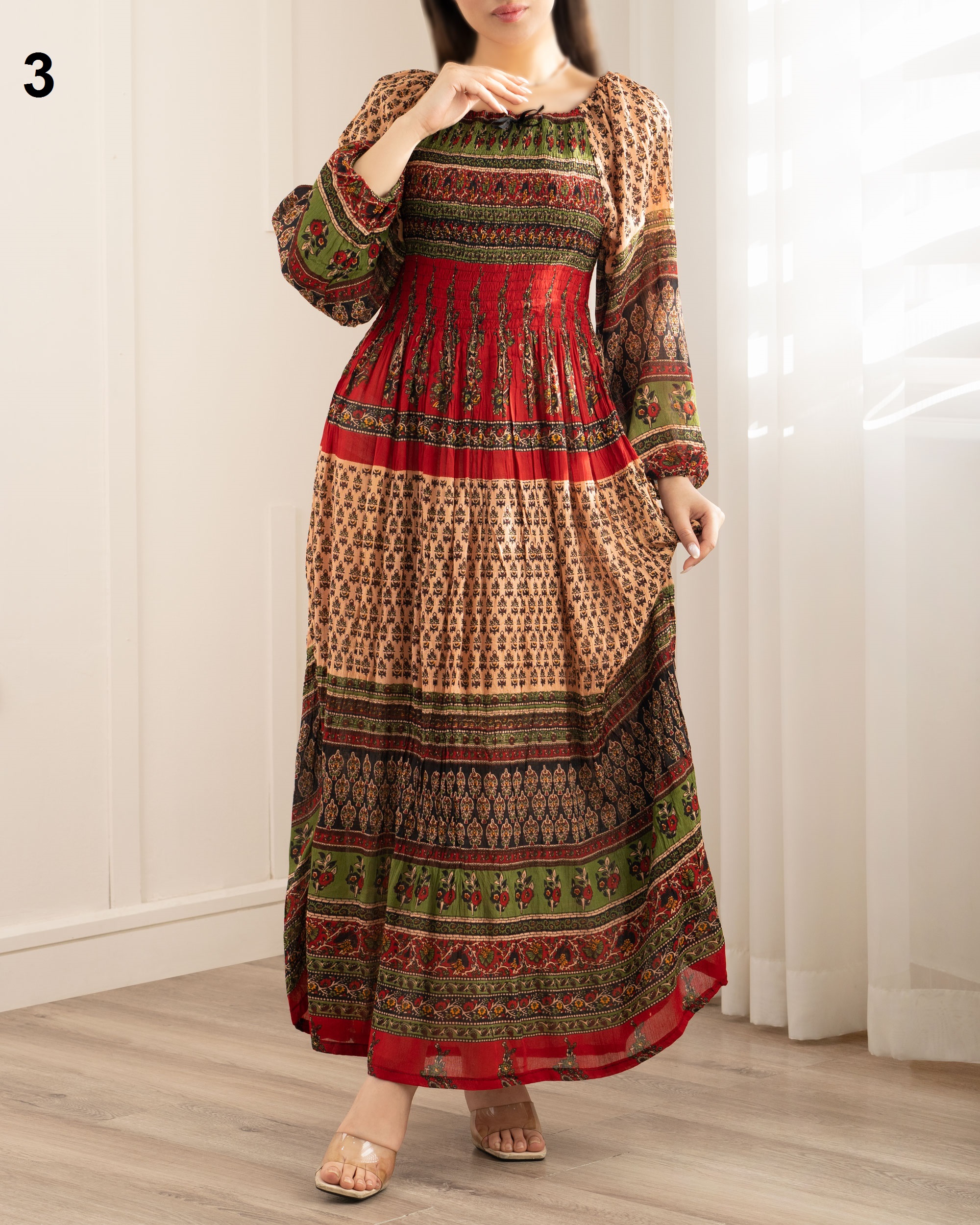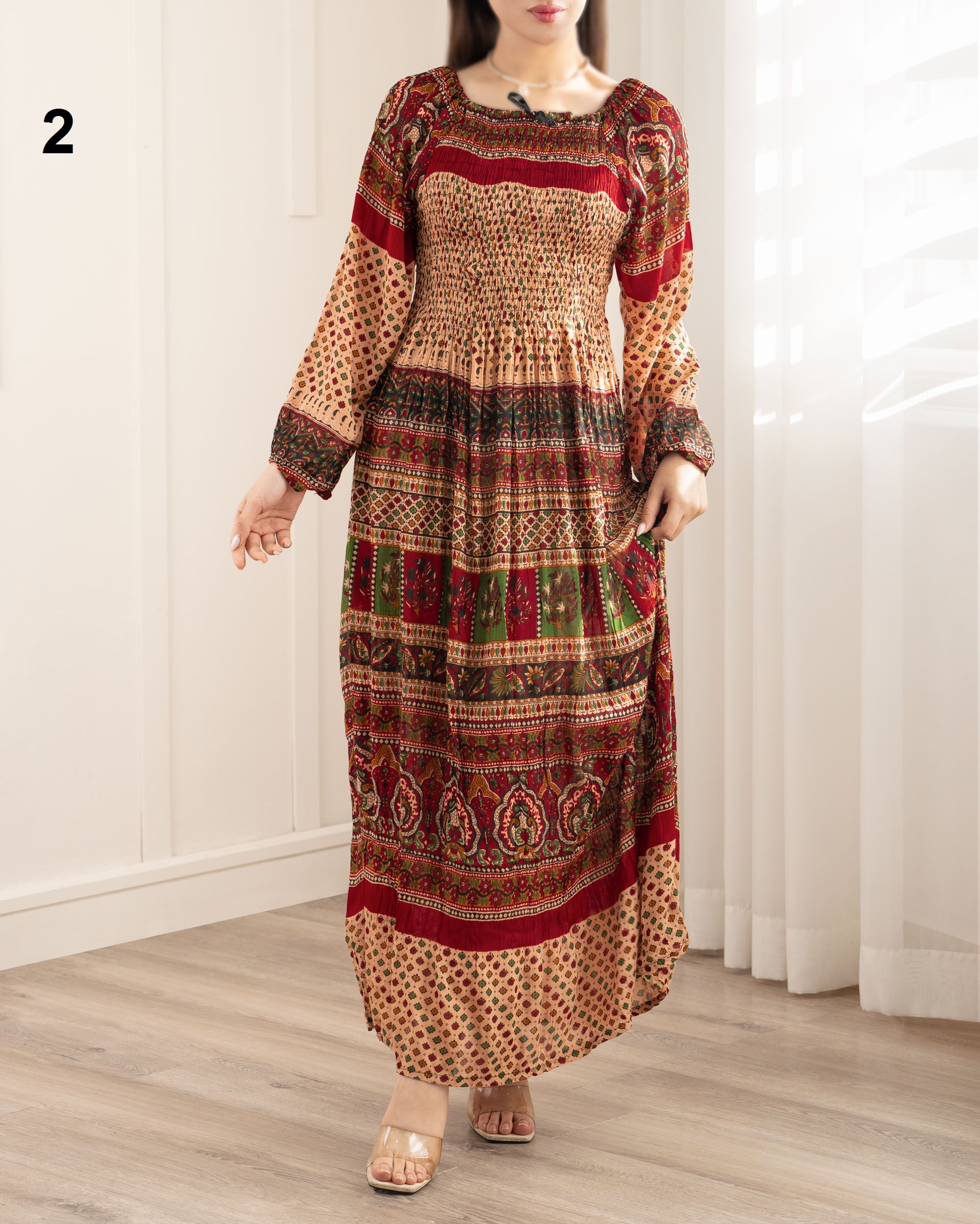 | تک سایز | مناسب دور سینه : 70 تا 120 سانتی متر دور باسن : حدودا 140 سانتی متر دور بازو : حدودا 44 سانتی متر آستین : از کنار یقه حدودا 55 سانتی متر قد لباس : حدودا 123 سانتی متر |