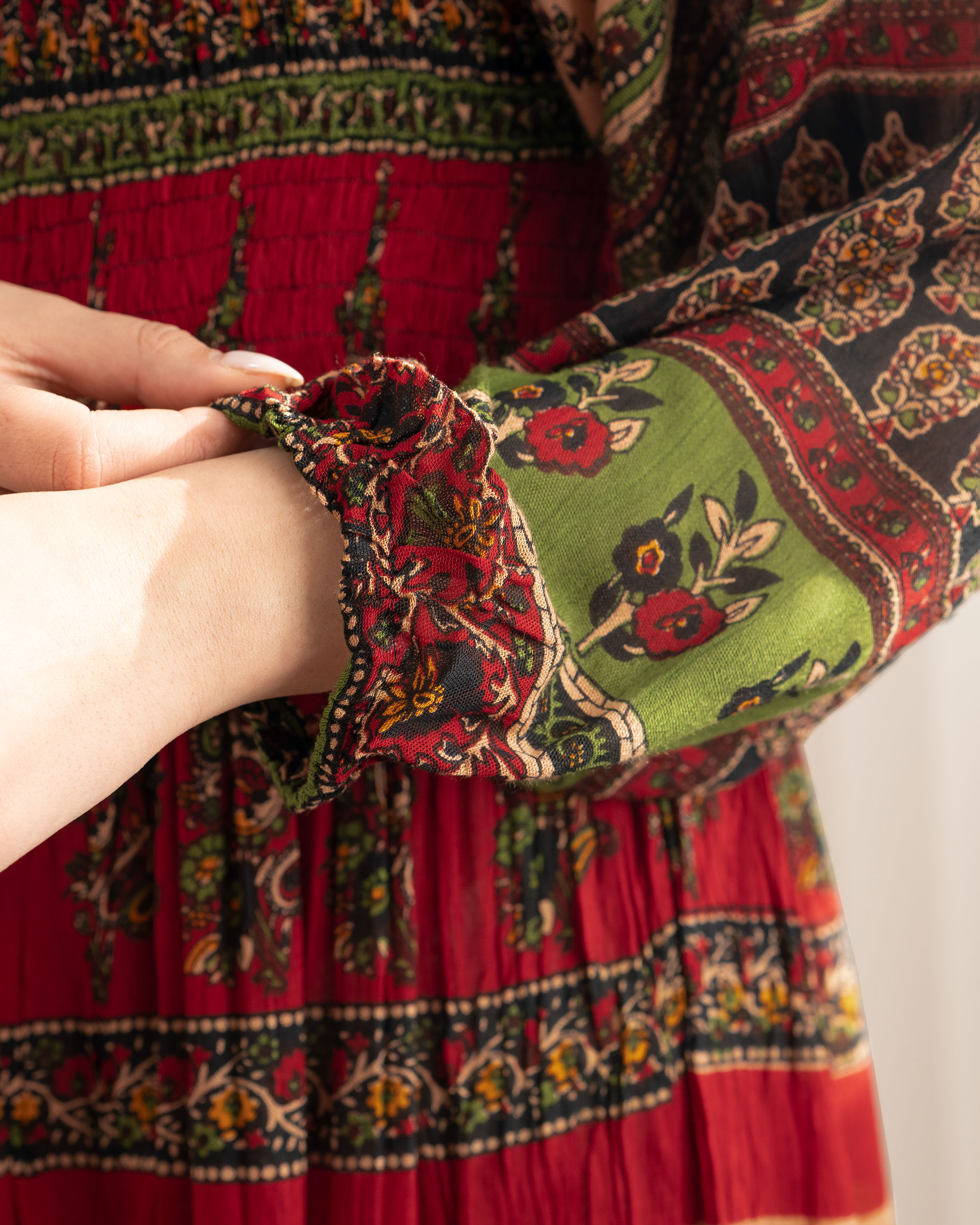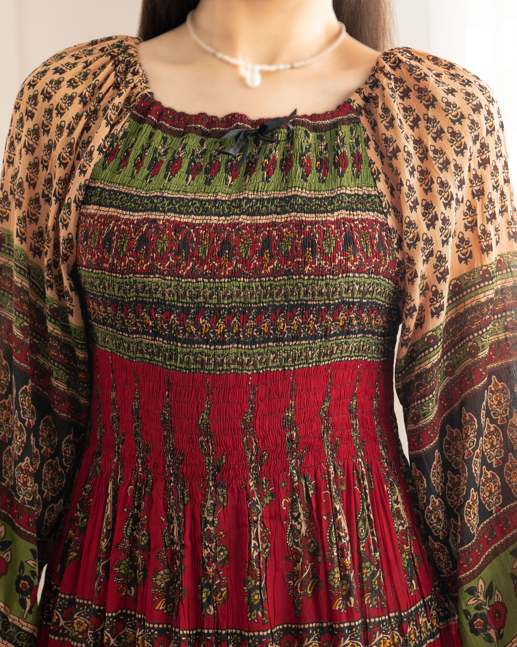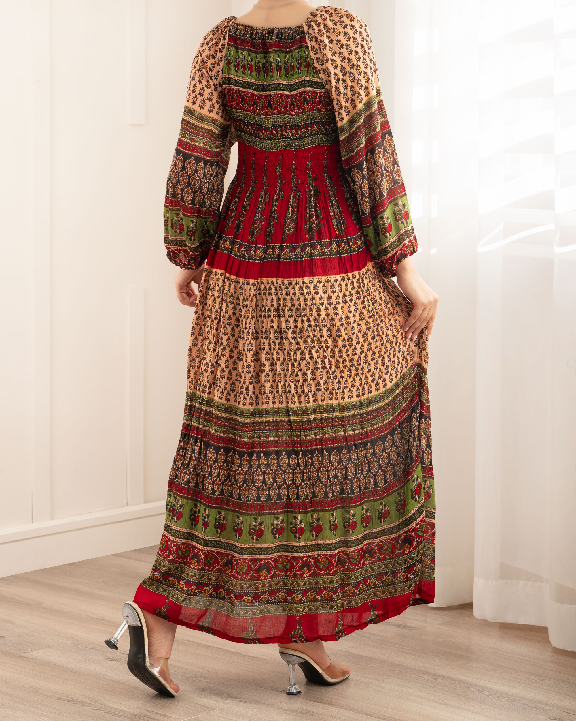 | تک سایز | مناسب دور سینه : 70 تا 120 سانتی متر دور باسن : حدودا 140 سانتی متر دور بازو : حدودا 44 سانتی متر آستین : از کنار یقه حدودا 55 سانتی متر قد لباس : حدودا 123 سانتی متر |