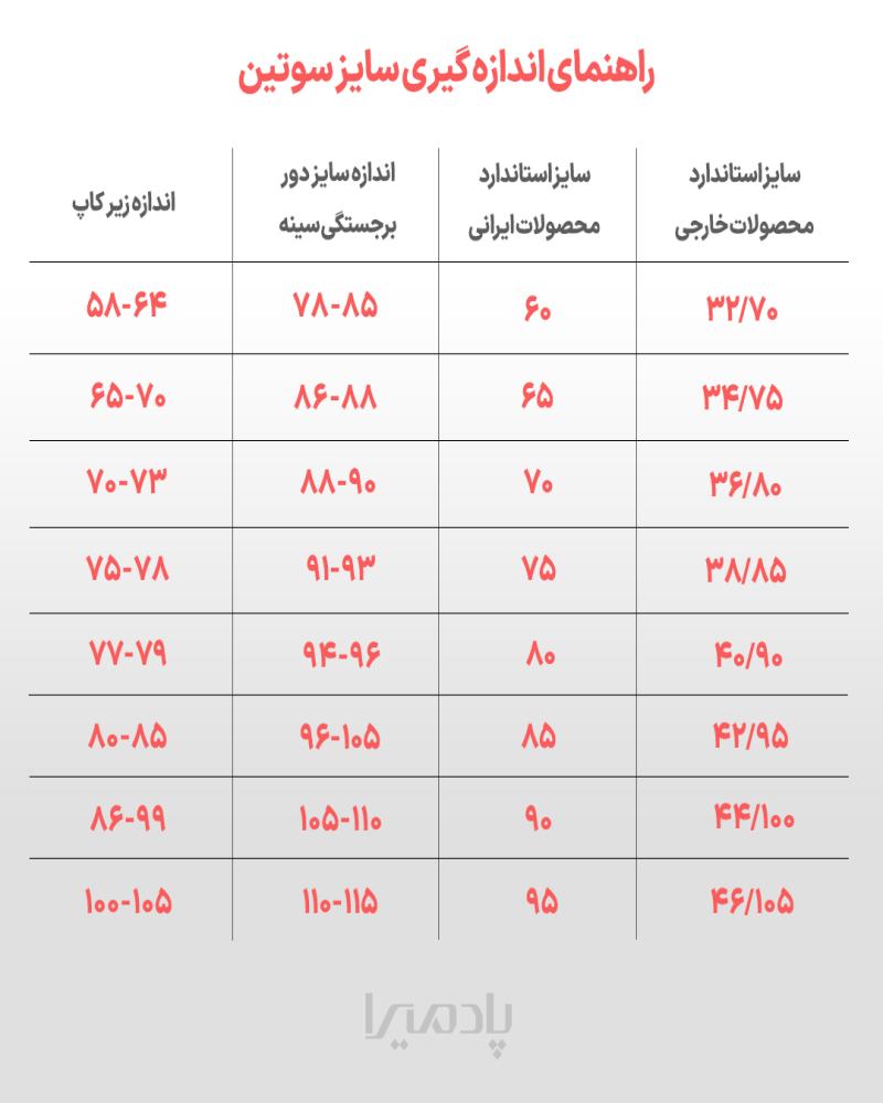 | سایز 80/36 | دور تنه با قازن اول : در حالت عادی 66 سانتی متر با کشیدن 74 سانتی متر دور تنه با قازن آخر : در حالت عادی 62 سانتی متر با کشیدن 70 سانتی متر |