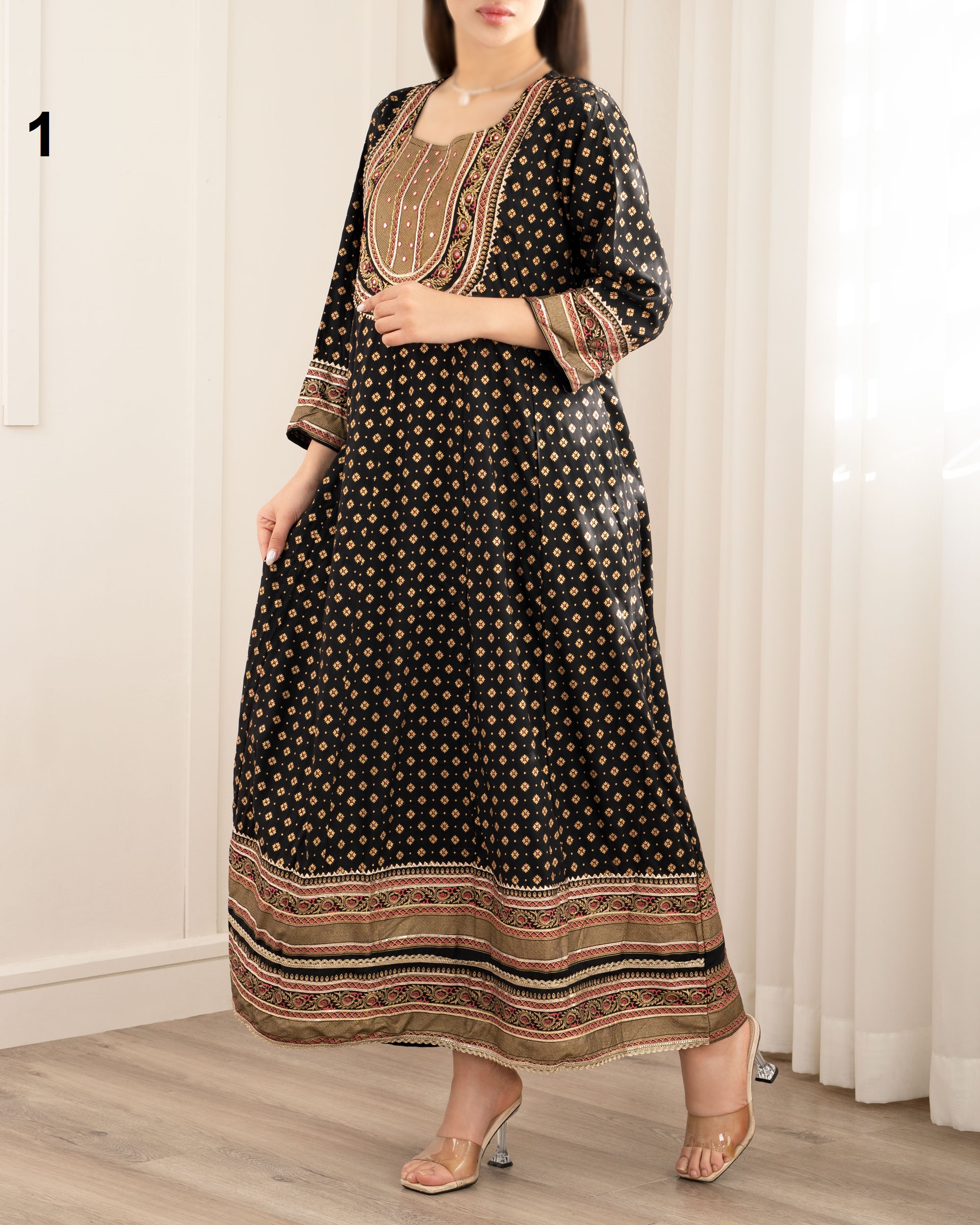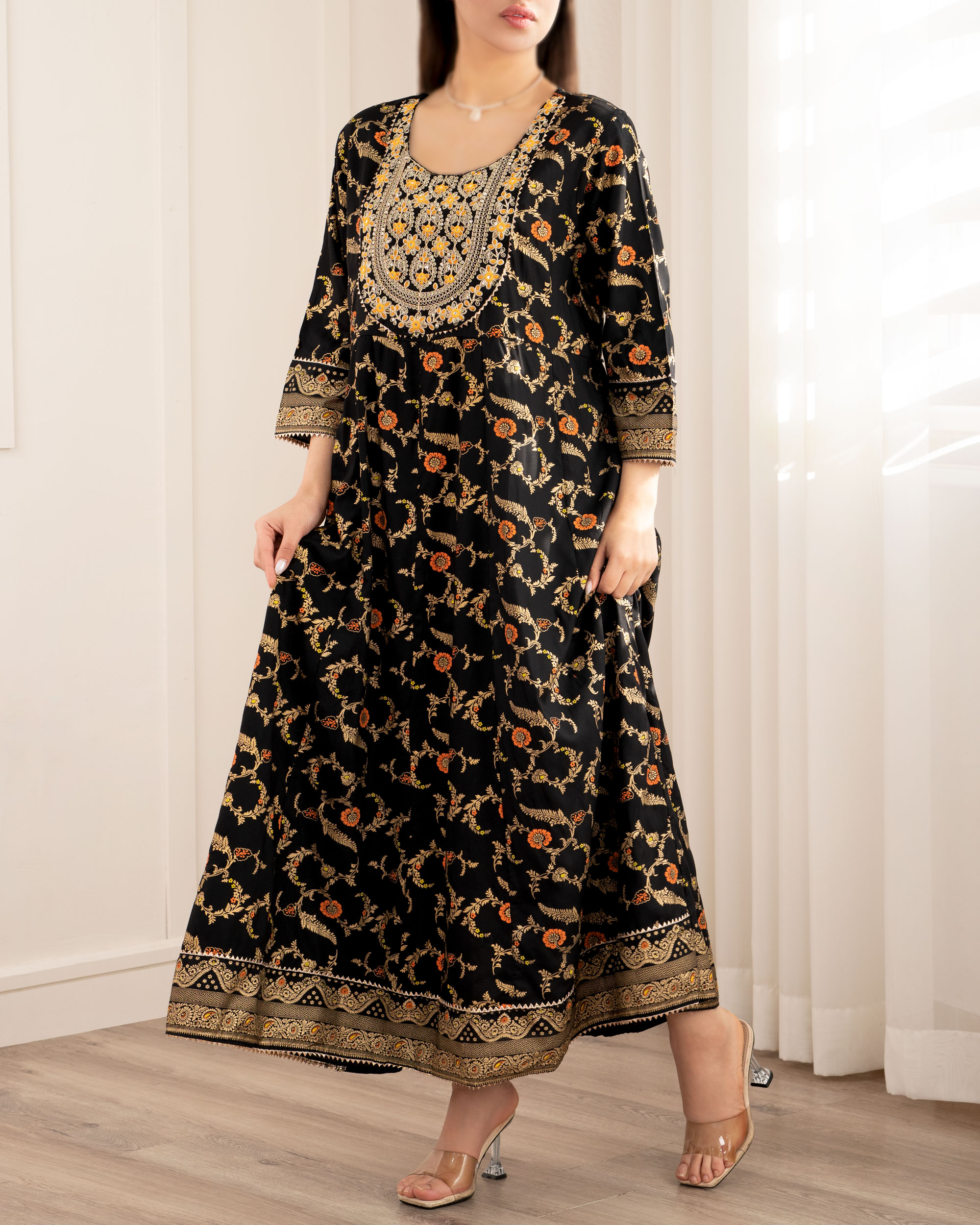 | سایز 4XL | دور سینه : حدودا 116 سانتی متر دور باسن : حدودا 138 سانتی متر دور کمر : حدودا 112 سانتی متر دور بازو : حدودا 40 سانتی متر آستین : از کنار یقه حدودا 53 سانتی متر قد لباس : حدودا 124 سانتی متر |