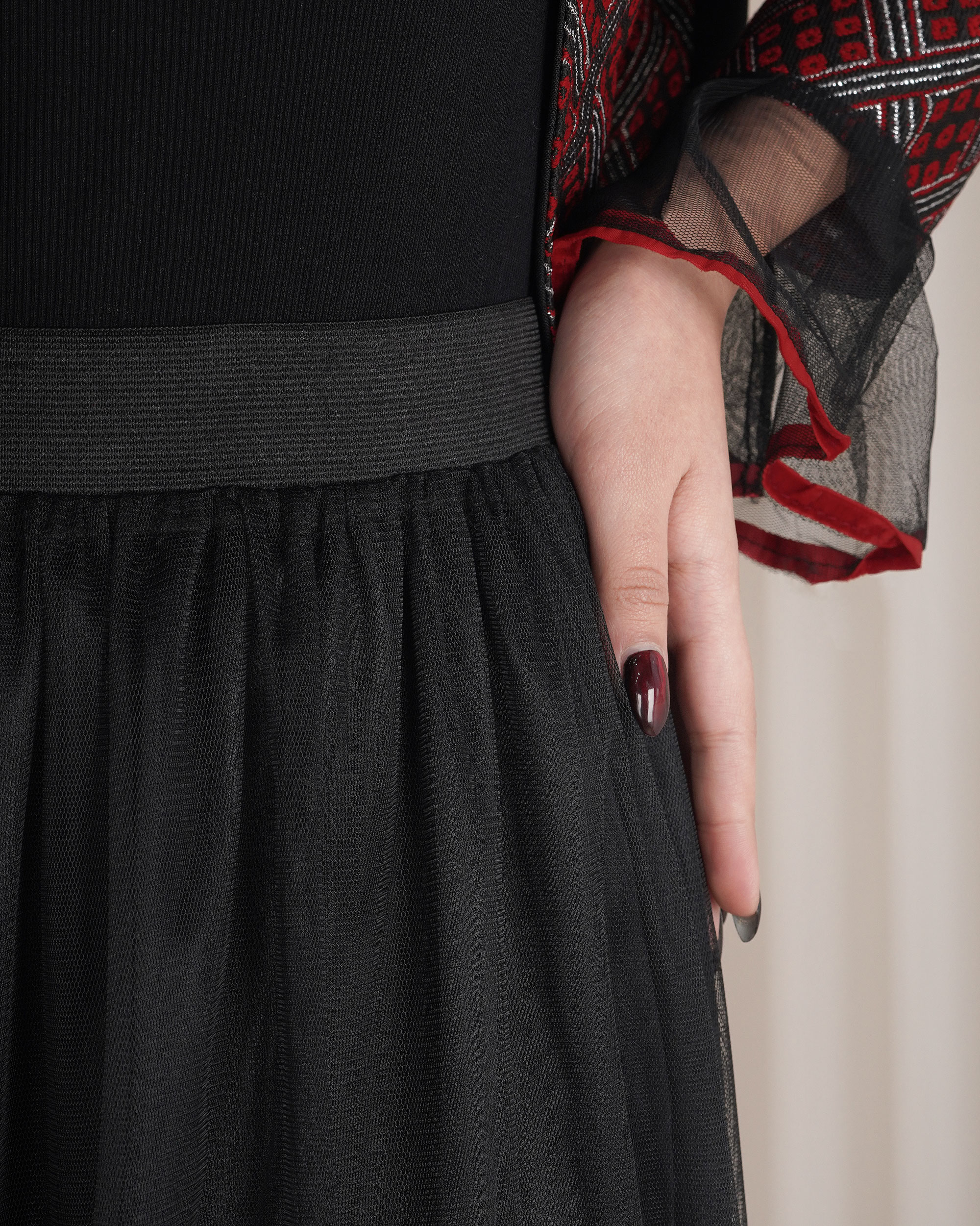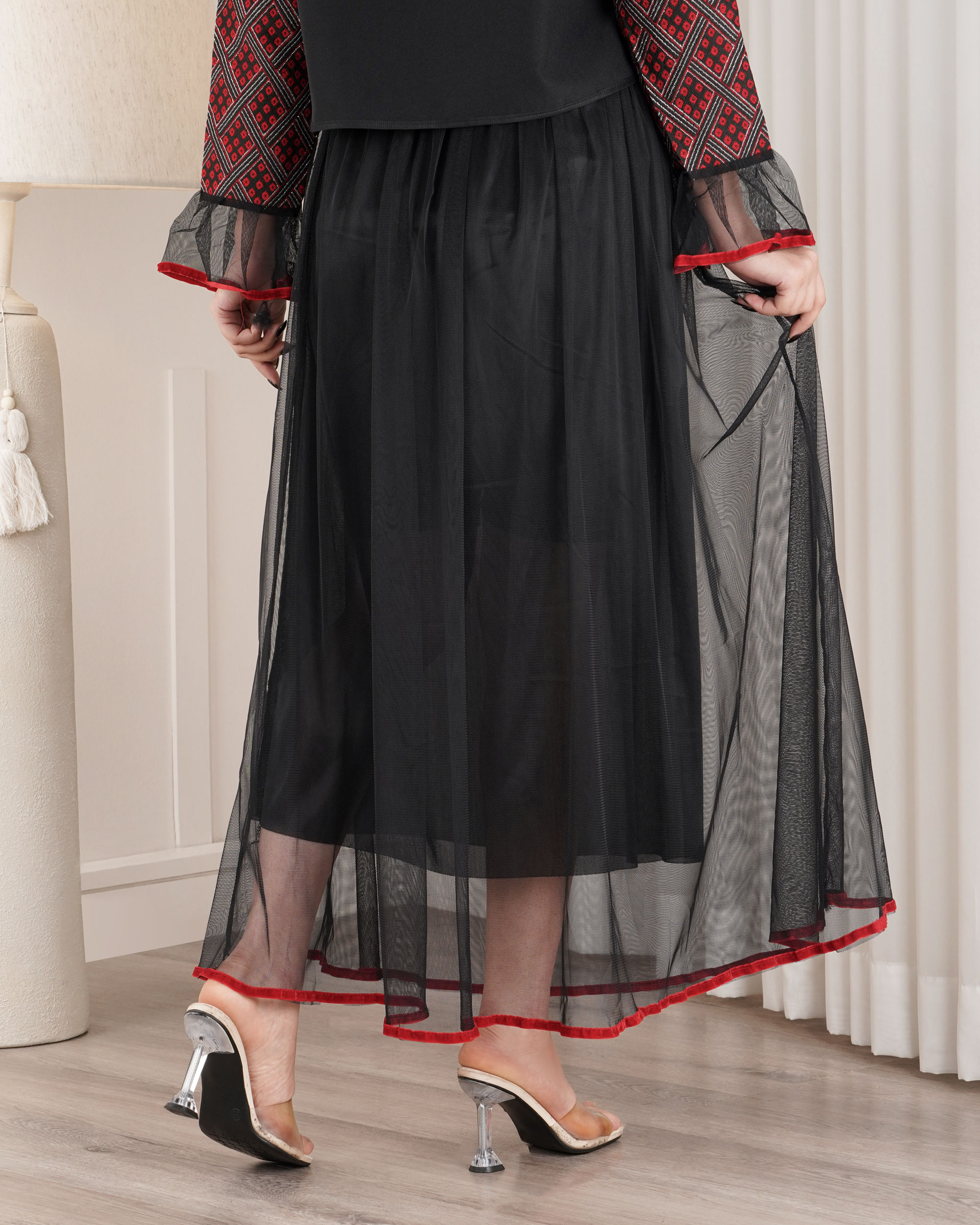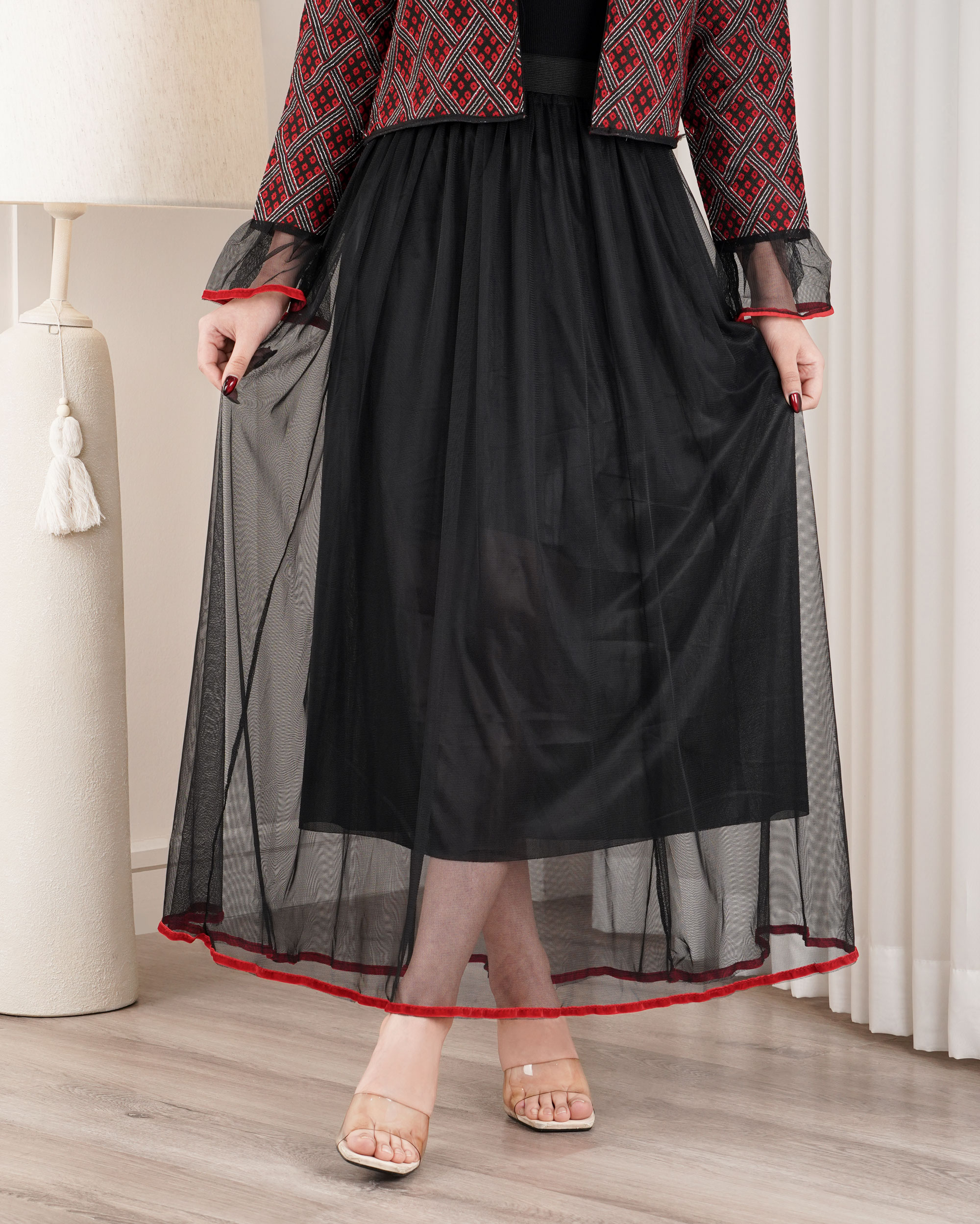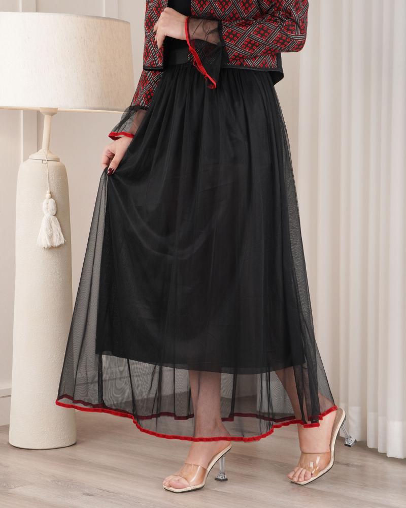| تک سایز | دور کمر : در حالت عادی 64 سانتی متر با کشیدن 94 سانتی متر دور باسن : حدودا 116 سانتی متر قد دامن : حدودا 95 سانتی متر قد آستر دامن : حدودا 80 سانتی متر |